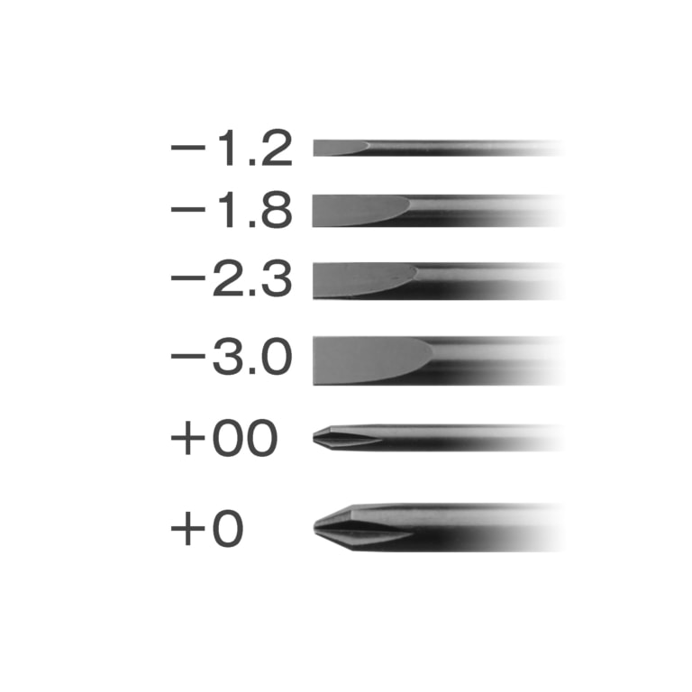 4 tô vít mini đầu dẹp: (−)1.2; (−)1.8; (−)2.3; (−)3.0